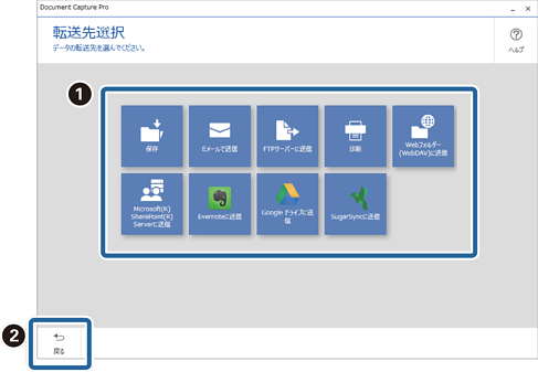 フォルダー保存、Eメール送信、FTPサーバー、印刷、Webフォルダー、Microsoft(R) SharePoint(R) Server、Evernote、Googleドライブ、SugarSync