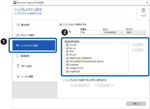 2[シンプルスキャン設定]をクリックし、[転送先表示設定]で表示させたくない転送先のチェックを外します。