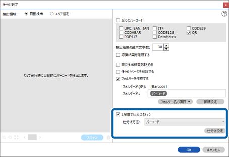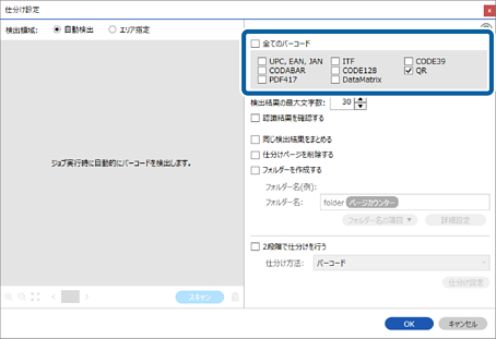 多くの情報を持つ2次元バーコードを使用する場合は、[検出結果の最大文字数]で仕分けに利用する最大文字数を指定してください。