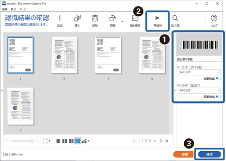 バーコードが正しく認識されたか確認したい場合は、[認識結果を確認する]にチェックを入れてください。スキャン後に表示される画面で、認識された領域や文字が確認できます。また、領域を指定し直して再認識させたり、文字を訂正したりすることもできます。
