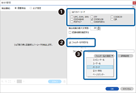 3[仕分け設定]画面で、1階層目のフォルダーに使用するバーコードの種類を選択します。