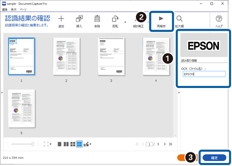 文字が正しく読み取れたか確認したい場合は、[認識結果を確認する]にチェックを入れてください。スキャン後に表示される画面で、認識された領域や文字が確認できます。また、領域を指定し直して再認識させたり、文字を訂正したりすることもできます。