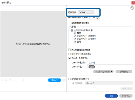 3[仕分け設定]画面で[認識対象]から読み取る文字の種類を選択します。