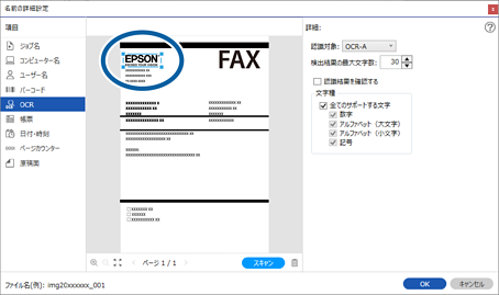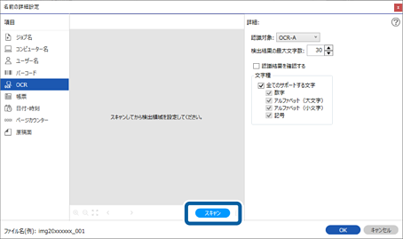 [検出結果の最大文字数]では、検出領域で読み取れる文字のうち、ファイル名に使用する最大文字数を指定できます。
