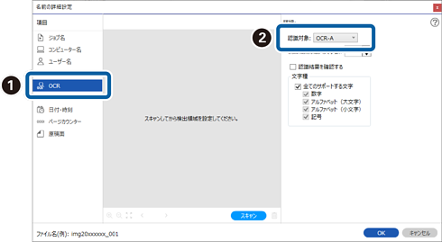 [ファイル名の項目]から[OCR]を選択するためには、[詳細設定]で設定をしてから選択してください。
