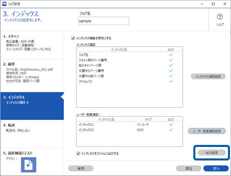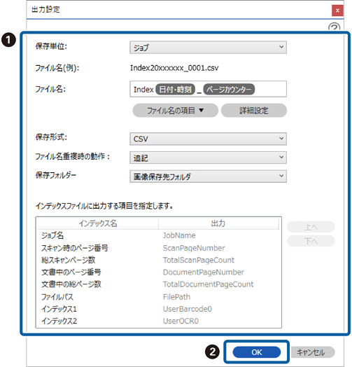 9インデックス項目をファイルに出力する際の出力項目やファイル名を設定して、[OK]をクリックします。