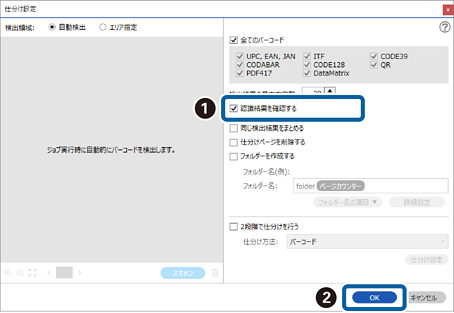 8[仕分け設定]画面で[認識結果を確認する]にチェックを入れて、[OK]をクリックします。