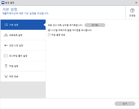 기본 설정 화면을 표시하려면 (Document Capture Pro 상단 화면에서)환경 설정을 클릭합니다.
