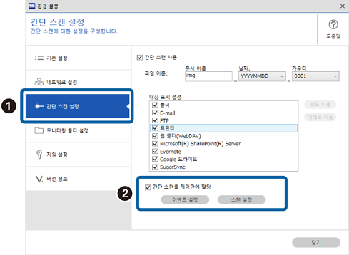 2간단 스캔 설정 탭을 클릭하고 간단 스캔을 제어판에 할당을 선택한 다음, 이벤트 설정을 클릭합니다.