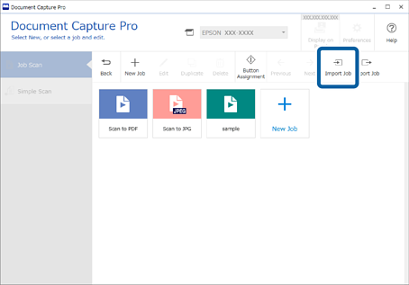 عند استيراد مهمة، يمكنك استخدام ملف مهمة (.jxz) أنشائه على كمبيوتر آخر وتصديره باستخدام Document Capture Pro.