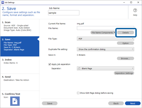 4قم بتهيئة الإعدادات لعرض شاشة نتائج الرمز الشريطي/خاصية التعرف الضوئي على الأحرف OCR المُستخدمة لأسماء الملفات. انقر فوق التفاصيل.
