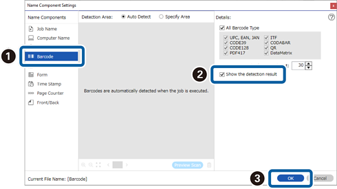 5على شاشة إعدادات مكونات الاسم، حدد الرمز الشريطي أو OCR وفقًا لمحتويات اسم الملف الذي ترغب في تعيينه، وحدد إظهار نتيجة الكشف، ومن ثمّ انقر فوق موافق.