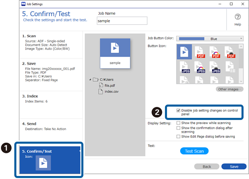 3Cliquez sur l’onglet 5. Confirmer / Tester, puis sélectionnez Désactiver les modifications des réglages du travail sur le panneau de commande.