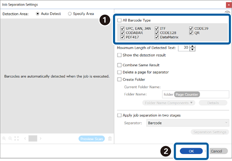 3Sur l’écran Paramètres de séparation de travaux, sélectionnez le type de code-barres que vous souhaitez utiliser (placé dans le document). Cliquez sur OK pour revenir à l’écran Paramètres de travaux.