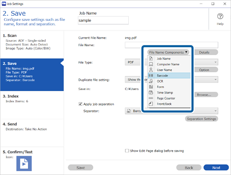 6Sélectionnez Code à barres dans Composants du nom de fichier.