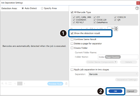8Sélectionnez Afficher les résultats de détection sur l’écran Paramètres de séparation de travaux, puis cliquez sur OK.