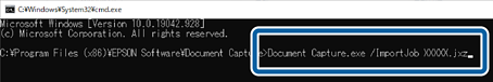 6Saisissez Document Capture.exe /ImportJob XXXXX.jxz (nom du fichier de travail), puis appuyez sur la clé Entrée pour l’exécuter.