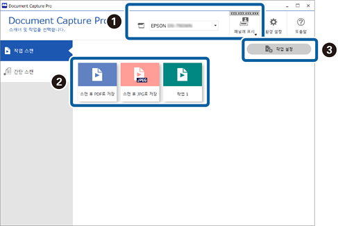기존 작업을 확인 및 편집하고 새 작업을 생성할 수 있습니다. 스캐너의 제어판 (버튼)이나 네트워크 인터페이스 패널 (또는 유닛)에서 작업 스캔을 수행하도록 설정 (이벤트 설정)할 수 있습니다. |