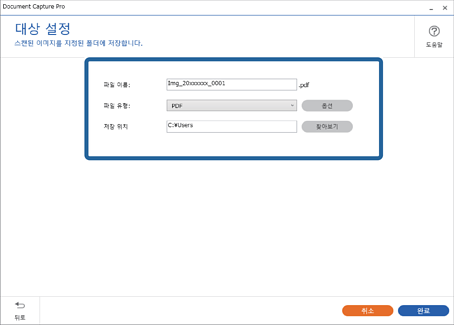 5대상 설정 화면에서 저장하려는 파일과 저장 형식을 설정합니다. 대상에 따라 세부 설정을 할 수 있습니다.