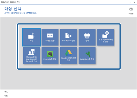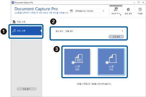 1Document Capture Pro 최상위 화면에서 사용하려는 스캐너를 선택하십시오. 소프트웨어를 시작하면 마지막으로 사용한 스캐너에 자동으로 연결됩니다.