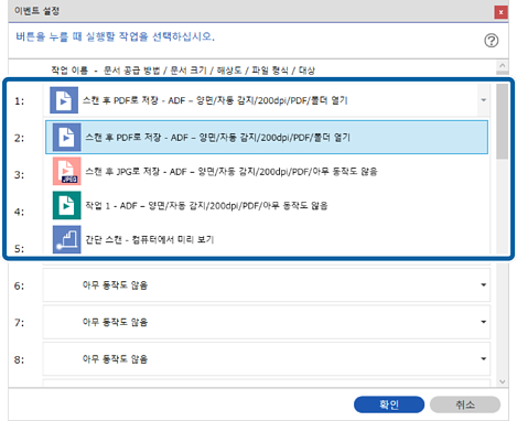 네트워크 인터페이스 패널(또는 유닛)을 사용할 경우 버튼에 최대 30개까지 작업을 할당할 수 있습니다. USB 연결을 사용하고 제어판이 없는 스캐너를 사용하는 경우, 작업을 버튼 1에 할당합니다.