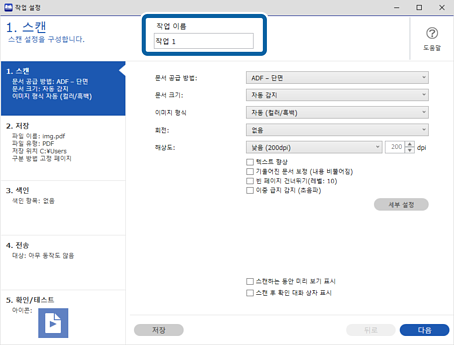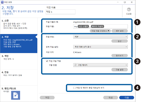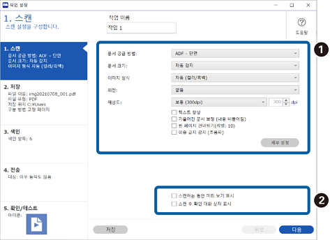 스캔 설정을 마치면 다음 또는 2. 저장를 클릭하십시오.2. 저장 탭을 클릭하십시오.