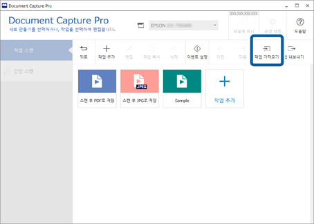 작업 가져오기를 실행할 때 다른 컴퓨터에서 생성하고 Document Capture Pro를 사용해서 내보내기한 작업 파일(.jxz)을 이용할 수 있습니다.