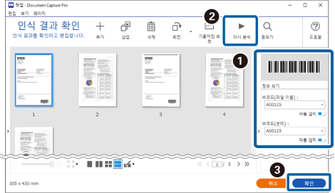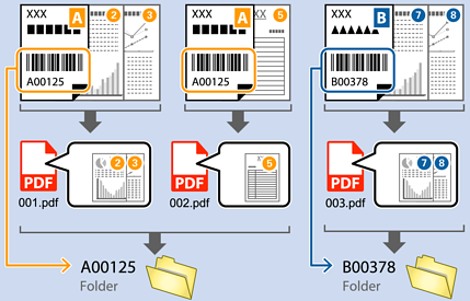 문서의 바코드 정보를 사용하여 바코드가 포함된 각 페이지 별로 파일을 분할하거나, 바코드 텍스트 정보를 사용하여 폴더를 만들고 저장할 수 있습니다.