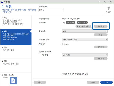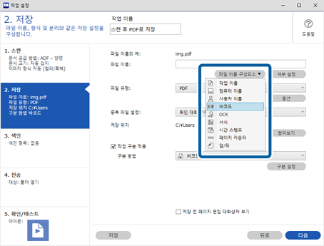 이 섹션에서는 “바코드별로 파일을 저장하고 바코드 내 텍스트 정보를 이용한 파일 이름으로 파일 저장하기”에 대한 작업 설정을 설명합니다.