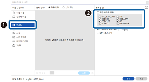 바코드(파일 이름 구성요소에서)을 선택하기 위해 세부 설정에서 설정을 지정한 다음 선택합니다.
