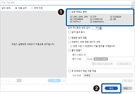 3작업 구분 설정 화면에서 사용하려고 하는 바코드 유형을 선택합니다(문서에 배치). 확인를 클릭해서 작업 설정 화면으로 돌아갑니다.