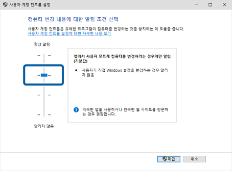 사용자 계정 컨트롤 설정 화면에서 레벨을 변경하십시오.