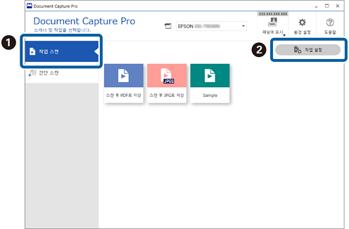1작업 스캔(Document Capture Pro 상단 화면에서)을 클릭한 후에 작업 설정를 클릭합니다.