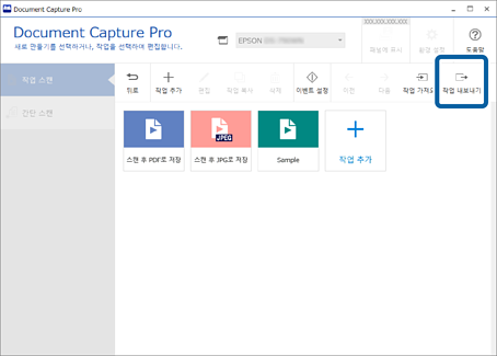 작업 내보내기를 실행하면 컴퓨터에 작업 파일(.jxz)로 저장됩니다. Document Capture Pro를 이용해서 가져오기를 수행함으로써 다른 컴퓨터에 있는 저장된 파일을 이용할 수도 있습니다.