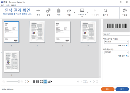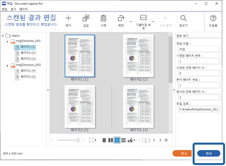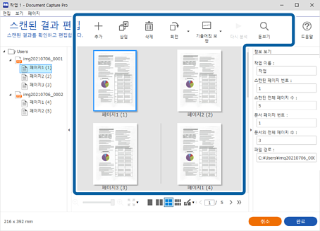 4스캔 설정에서 저장 전 페이지 편집 대화상자 보기가 선택된 작업의 경우 스캔 후 스캔된 결과 편집 화면에서 스캔 결과를 확인한 다음 필요에 따라 편집하십시오.