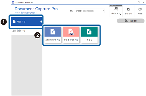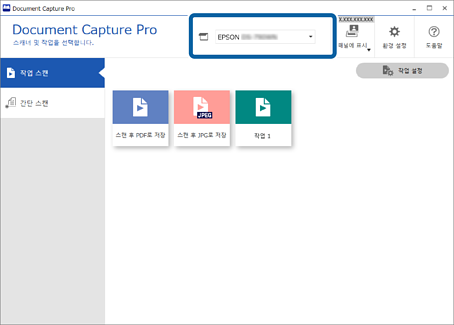 1Document Capture Pro 최상위 화면에서 사용하려는 스캐너를 선택하십시오. 소프트웨어를 시작하면 마지막으로 사용한 스캐너에 자동으로 연결됩니다.