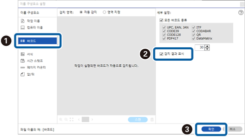 5이름 구성요소 설정 화면에서 설정하려는 파일 이름의 내용에 따라 바코드 또는 OCR을 선택하고, 감지 결과 표시를 선택한 다음 확인을 클릭합니다.