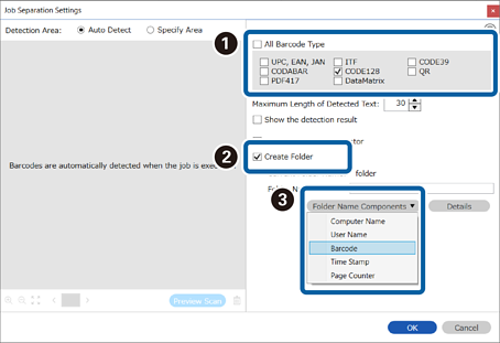 6Para além disso, na janela Definições de Separação dos Trabalhos, selecione o tipo de código de barras que pretende utilizar para a segunda pasta, selecione Criar Pasta, selecione Código de barras em Componentes do nome da pasta, e adicione-o a Nome da Pasta.