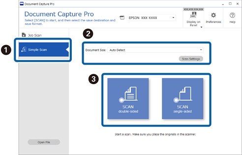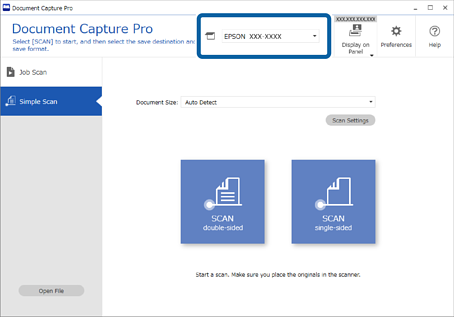 1Selecione o scanner que pretende utilizar na janela superior Document Capture Pro. Ao iniciar o software, liga-se automaticamente ao último scanner utilizado.