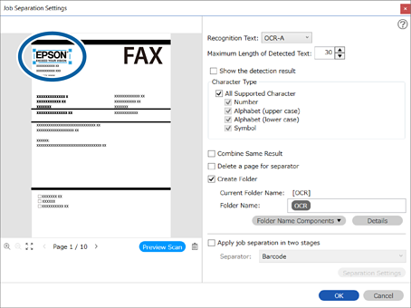 3Na janela Definições de Separação dos Trabalhos, selecione o tipo de texto lido em Reconhecimento de texto. Selecione Criar Pasta, e a seguir selecione OCR em Componentes do nome da pasta.