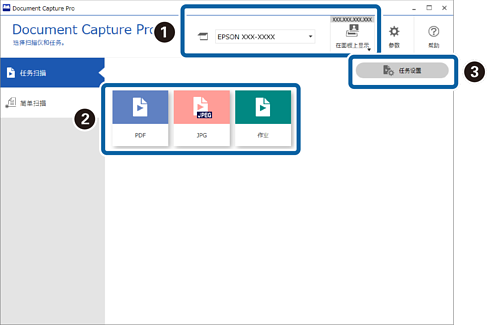 您可检查和编辑现有任务,并创建新任务。 您可以进行设置(按键分配)以便能从扫描仪的操作面板(按键)或网络界面面板(或单元)执行任务扫描。 |