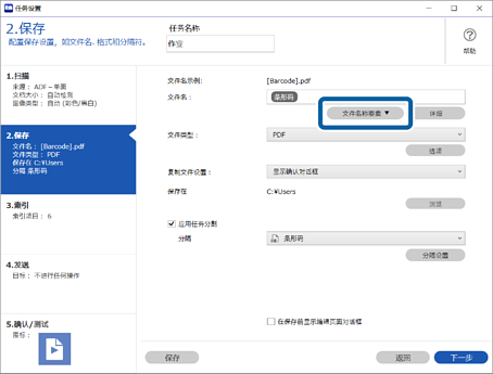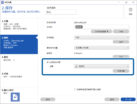 如果您想要显示用于任务分隔的条形码/OCR 识别结果屏幕,请前往步骤 7。如果不需要进行此设置,请保存任务。