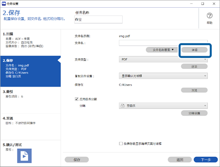 4配置设置以显示用于文件名的条形码/OCR 识别结果屏幕。单击 详细。