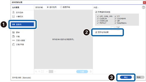 5在 名称要素设置 屏幕上,根据要设置的文件名内容选择 条形码 或 OCR,选择 显示检测结果,然后单击 确定。