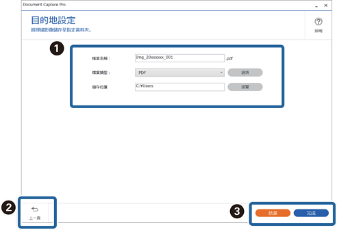 選取目的地後,你可以在此畫面上進行細部設定,例如要儲存的檔案名稱或檔案類型。