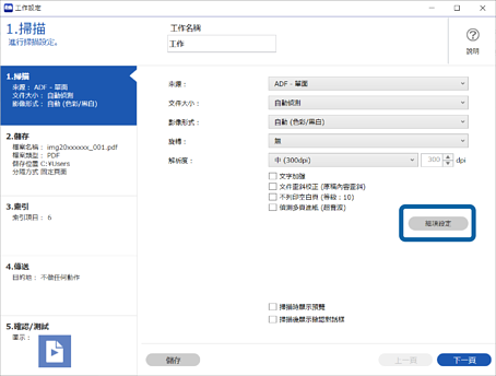 按下 [工作設定] 畫面上的 [1.掃描] 索引標籤,然後按下 [細項設定]。