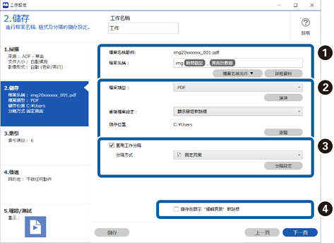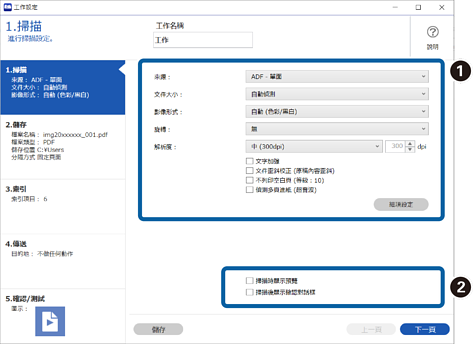 完成掃描設定後,按下 [下一頁] 或 [2.儲存] 索引標籤。