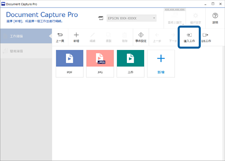 匯入工作時,您可以使用在其他電腦上建立並使用 Document Capture Pro 匯入的工作檔案 (.jxz)。