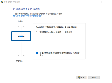 在[使用者帳戶控制設定] 畫面上變更等級。