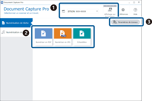 Vous pouvez vérifier et modifier les travaux existants et en créer de nouveaux. Vous pouvez définir des paramètres (Affectation du bouton) pour pouvoir effectuer des numérisations de travaux depuis le panneau de commande (boutons) du scanner ou du panneau d’interface réseau (ou l’unité). |